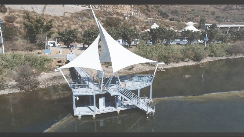 固定在藍藻聚集點的鋼結(jié)構(gòu)打撈作業(yè)平臺,配置高效可調(diào)式渦井取藻器,智能調(diào)節(jié)、高效汲取富集水面表層5cm的高濃度藍藻藻漿。