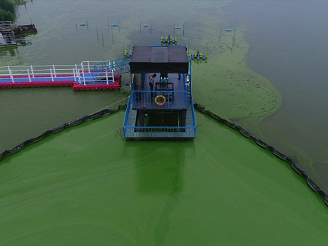 固定在藍藻聚集點的鋼結構打撈作業平臺,配置高效可調式渦井取藻器,智能調節、高效汲取富集水面表層5cm的高濃度藍藻藻漿。