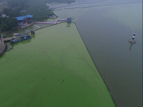 由浮體、水下裙體、水下配重物、固定纜繩、水底固定樁構成,可隨風浪浮動,對水體中的藍藻形成阻攔但不影響水體交換,具有很好的擋藻和導藻的效果,在太湖、滇池、巢湖、洱海和星云湖等眾多藍藻暴發水域已有規模化應用。