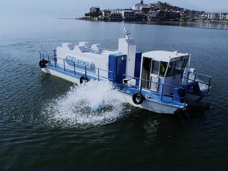 公司研發的加壓控藻船,以玻璃鋼船體為平臺,配置藍藻打撈、壓力控藻和曝氣裝置...