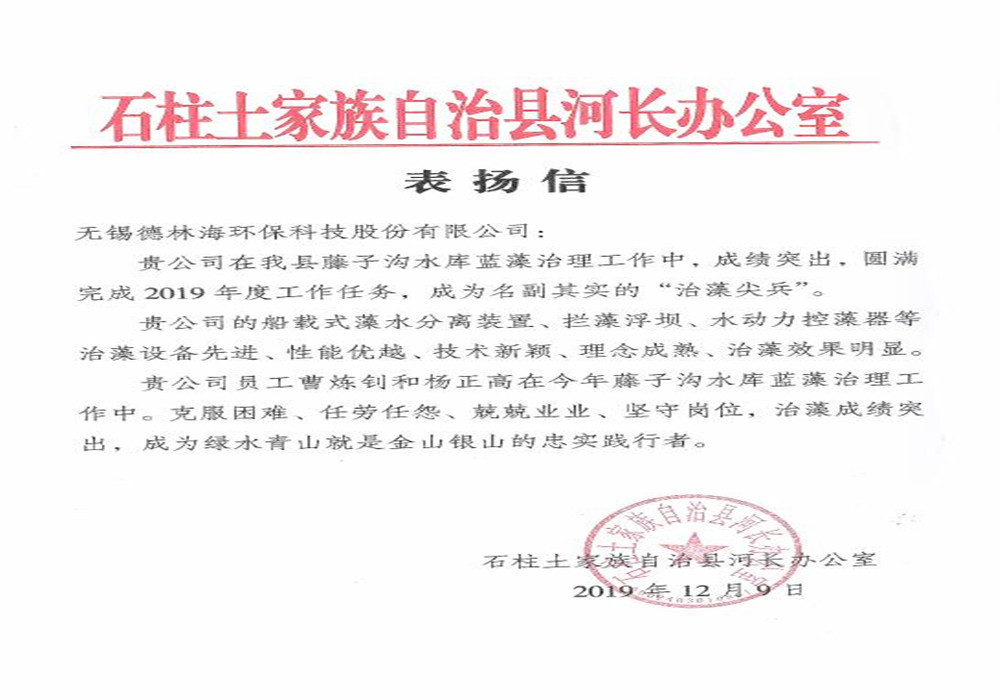 今年4月,重慶石柱土家族自治縣河長辦公室向我司采購了船載式藻水分離裝置、攔藻浮壩、水動力控藻器等治藻設備,由于現場作業條件特殊,我司員工克服困難、任勞任怨、兢兢業業的完成了工作任務。信中對我司圓滿完成重慶藤子溝水庫藍藻治理工作,給予高度好評,贊揚我司是名副其實的“治藻尖兵”。