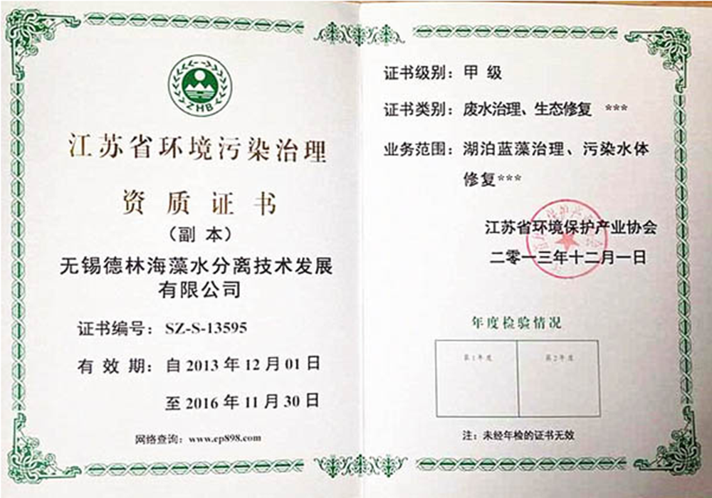 無錫德林海藻水分離技術發展有限公司于2013年12月1日榮獲環境污染治理甲級資質證書,業務范圍是湖泊藍藻治理、污染水體修復。此證書是本行業全國范圍內藍藻治理、污染水體修復的甲級資質證書。