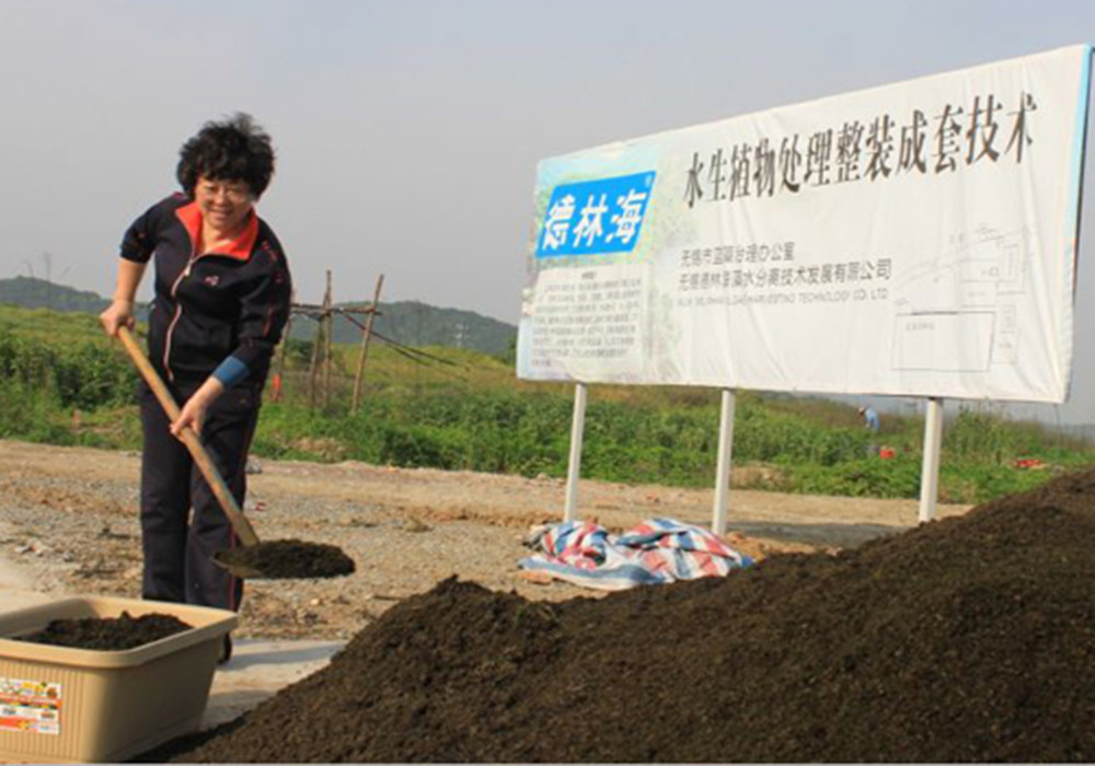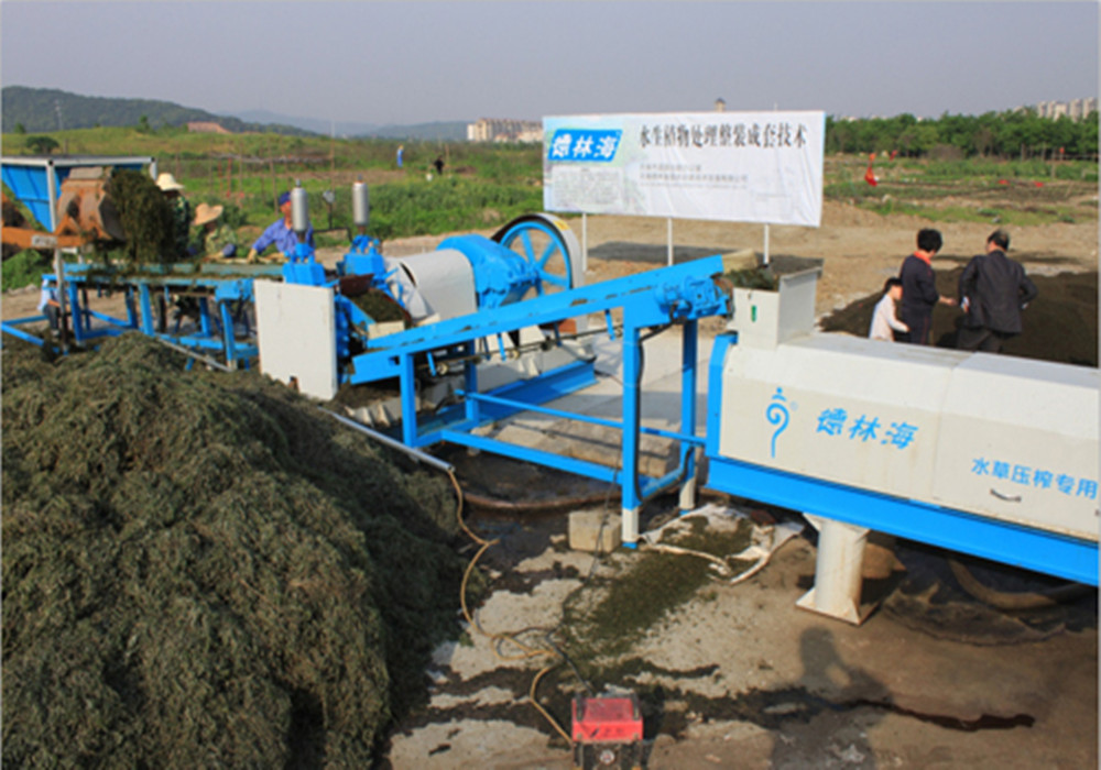 無錫太湖梅梁灣水草處理基地位于漁港藻水分離站鄰側(cè),占地約1200m2,由無錫德林海公司投資、研發(fā)和建設(shè)。德林海公司研發(fā)的水生植物處理整裝成套技術(shù)能將水草、水葫蘆、水花生等水生植物由水分大于95%的鮮草狀態(tài)處理成水分小于65%的固態(tài)渣狀,從而便于實(shí)現(xiàn)無害化處置和資源化利用。水生植物處理能力每天300噸。