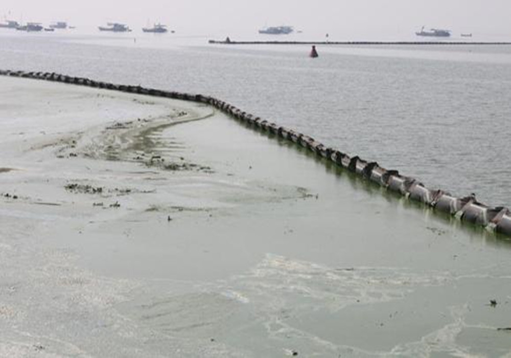 以上三張圖非常直觀的說明了在過去。藍(lán)藻的打撈一直是個大問題。那么如今科技飛速發(fā)展,藍(lán)藻治理技術(shù)已經(jīng)升級為一種完善的技術(shù)體系。首先從藍(lán)藻的區(qū)域分割來看:以前分割的方法都是用泥建壩這會導(dǎo)致什么問題。第一:壩的高度和水位的高度不一致。第二:工程性質(zhì)耗時大。那么現(xiàn)在我們用什么來分割的呢?看以下圖片: