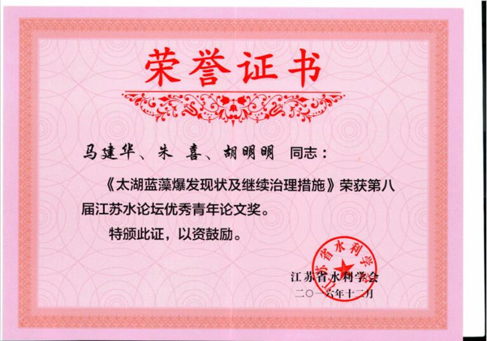 恭賀馬建華、朱喜、胡明明同志編寫的《太湖藍藻爆發出狀及繼續治理措施》榮獲第八屆江蘇水論壇優秀青年論文獎。