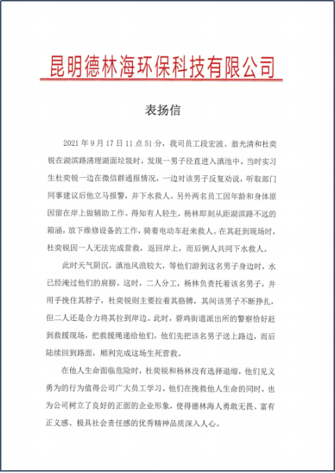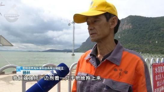 此時,在湖邊清理湖面的昆明德林海環保科技有限公司員工段宏波、翁光清和實習員工杜奕銳發現這一情況立刻跑過去,大聲勸說。同時在工作群中通報此事,請求附近的同事支援。另外一名同事同時報警。而在附近工作的楊林得知這個事情后,立馬騎電動車趕來。