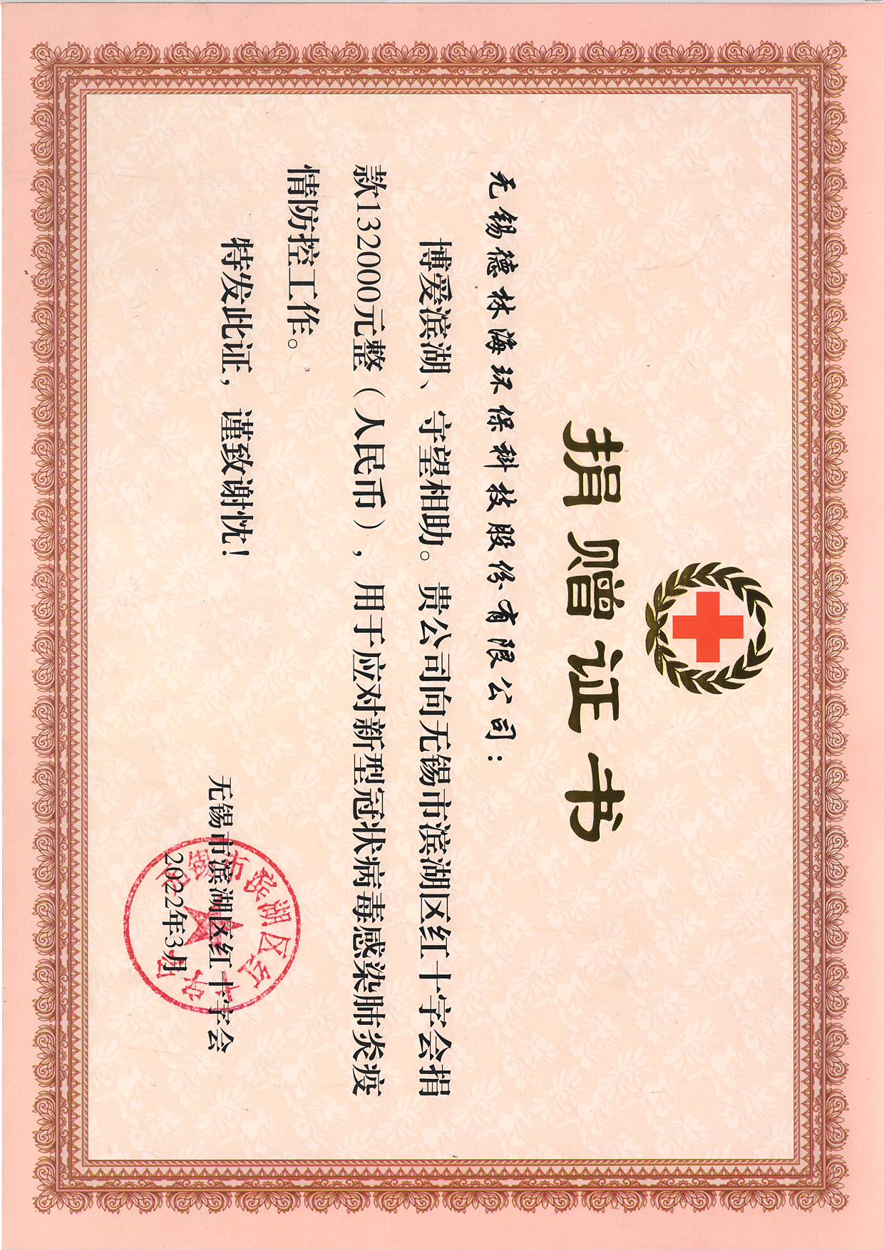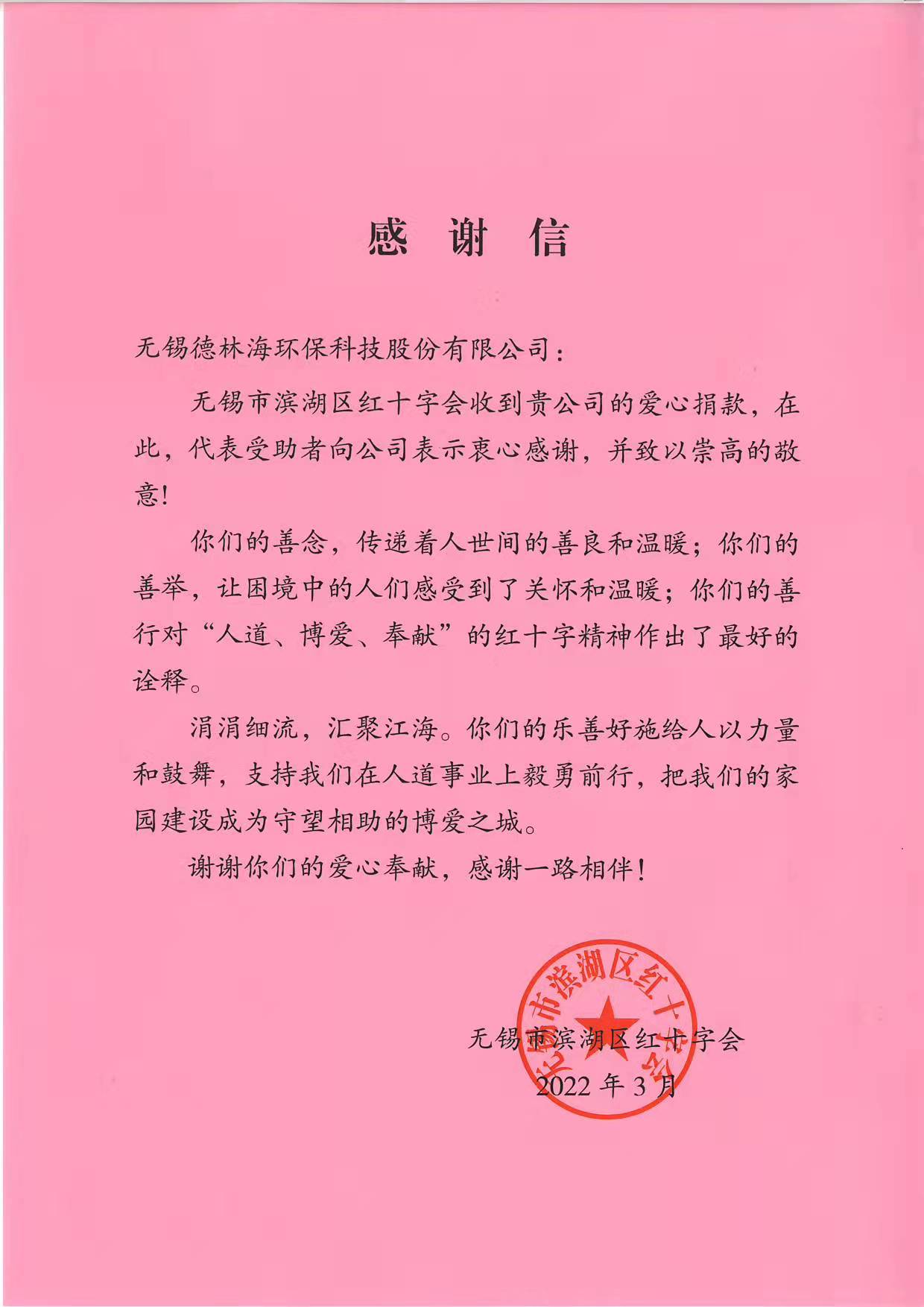 2022年3月14日,德林海向無錫市濱湖區(qū)紅十字會捐款人民幣132000元整,用于應(yīng)對新冠肺炎疫情防控工作。