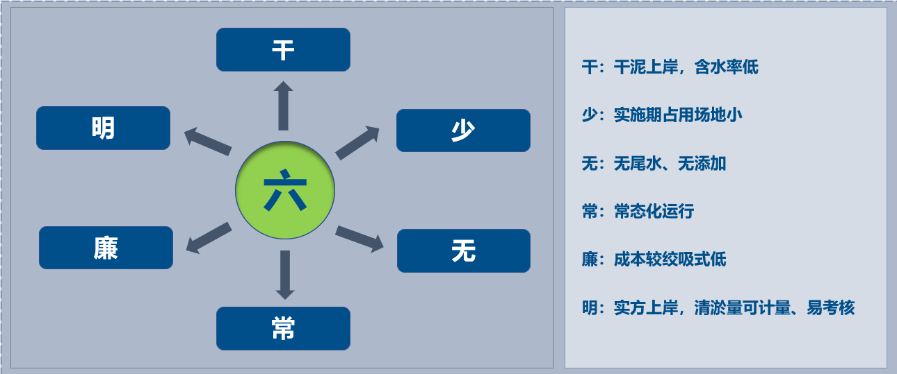 “干、少、無、常、廉、明”是干泥法清淤整裝成套技術六大核心技術特點,分別代表了干泥上岸,含水率低;實施期占用場地小;無尾水、無添加;常態化運行;成本較絞吸式低;實方上岸,清淤量可計量、易考核的技術優勢。該技術適用于無堆場、對尾水排放、底泥含水率及清淤擾動要求高的清淤工程。
