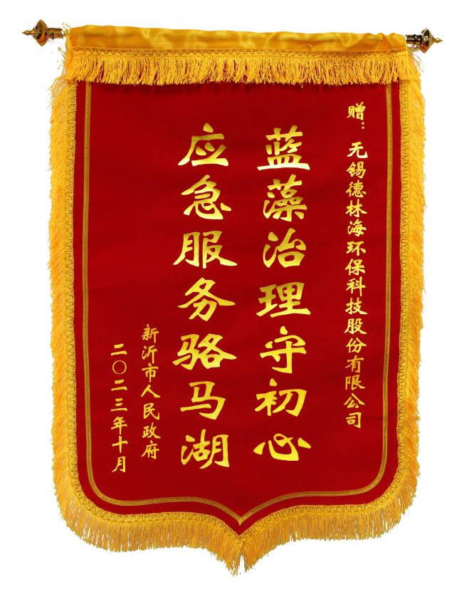 2023年11月1日,德林海收到新沂市人民政府頒發(fā)的錦旗。錦旗上書“藍(lán)藻治理守初心 應(yīng)急服務(wù)駱馬湖”,以表彰德林海在駱馬湖藍(lán)藻爆發(fā)應(yīng)急處置中的突出表現(xiàn)。