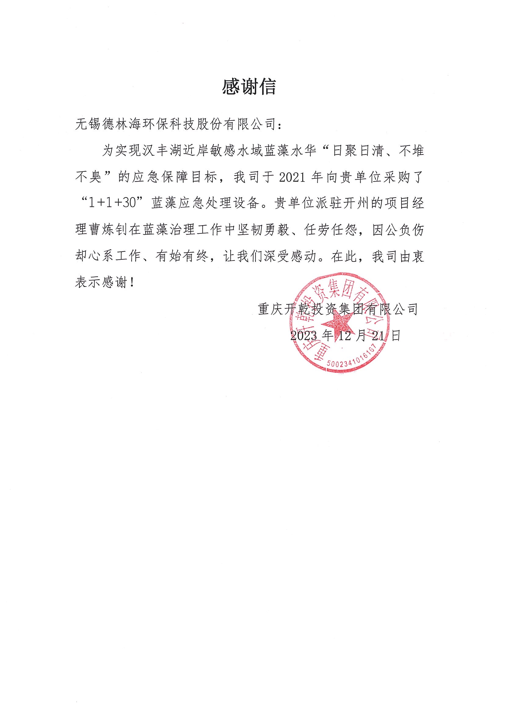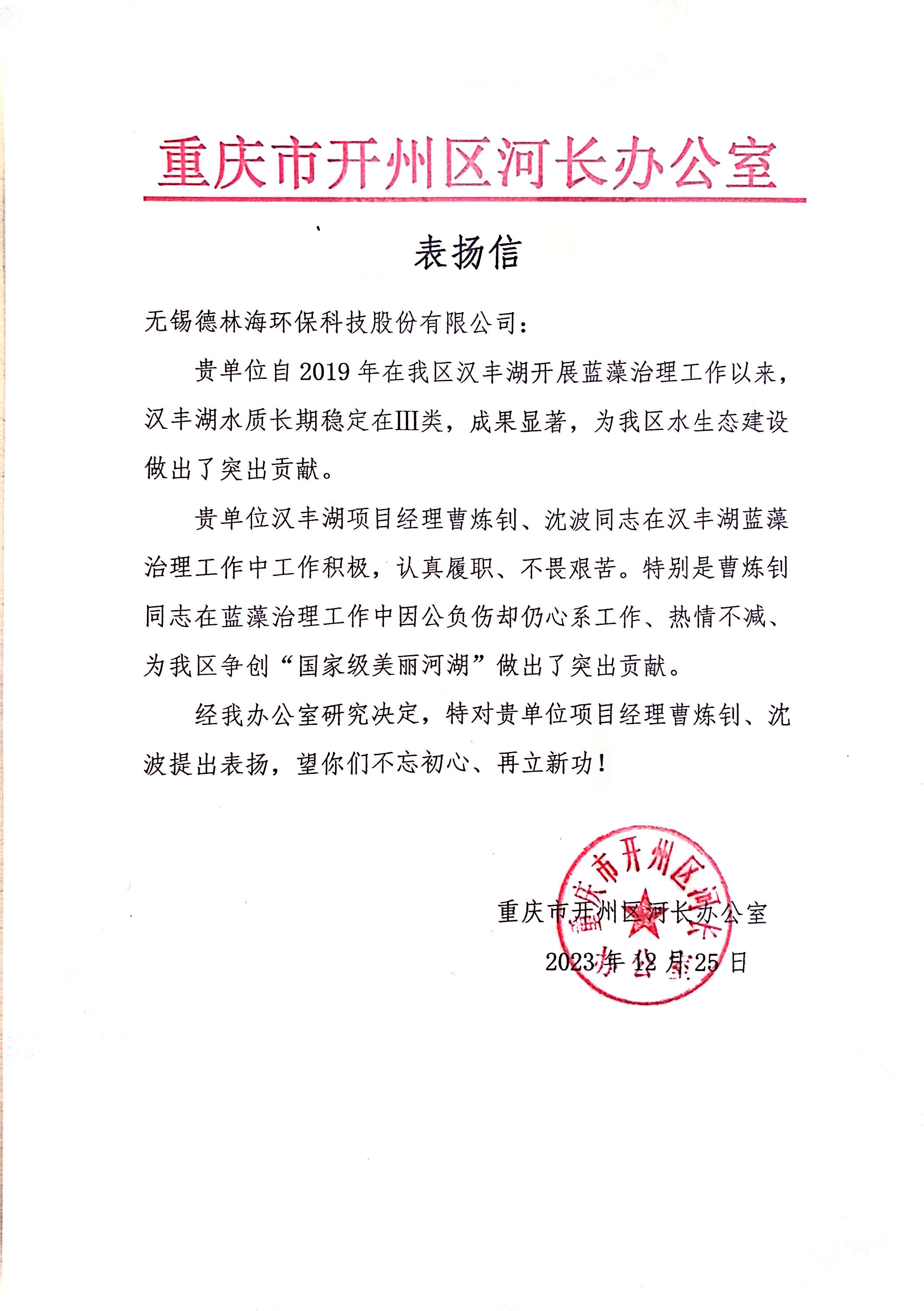 近日,德林海接連收獲喜訊,重慶市開州區(qū)河長辦公室、重慶開乾投資集團有限公司分別向我司發(fā)來表揚信與感謝信,以表彰德林海在漢豐湖藍藻治理工作及當(dāng)?shù)厮鷳B(tài)建設(shè)工作中的突出貢獻。文中還特別對我司員工曹煉釗和沈波在工作中表現(xiàn)出的堅韌勇毅、不畏艱苦等優(yōu)秀品質(zhì)予以高度肯定。