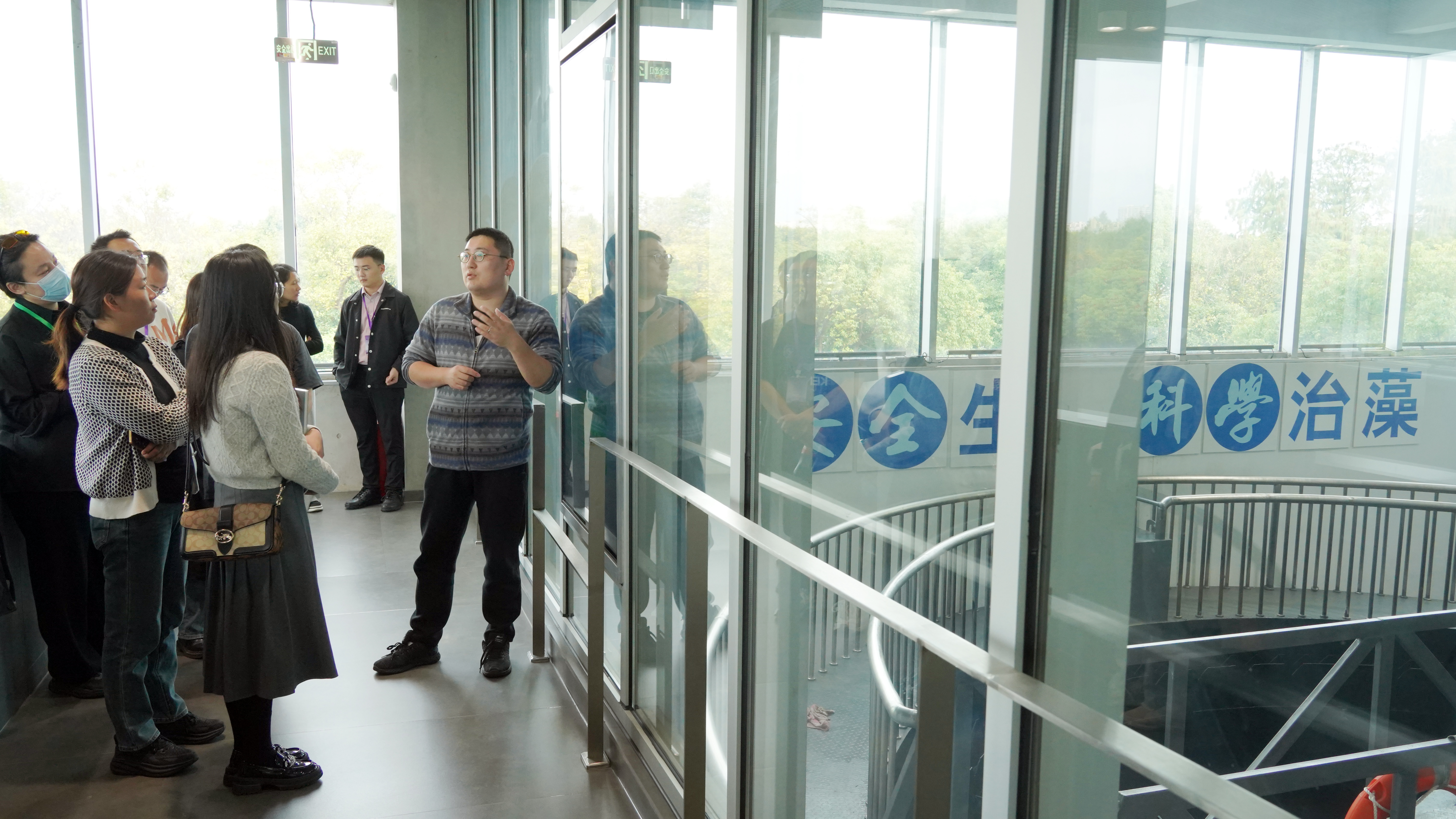 德林海診斷中心總監徐項哲做了主題為《藍藻治理——湖泊生態醫院治理模式》的報告,陪同各位參會領導和專家參觀考察許仙港藻水分離站、張橋港原位控藻工程和湖泊生態醫院,并詳細介紹了包含深潛式加壓控藻技術、污染底泥常態化精準治理整裝成套技術在內的富營養化湖庫保護治理技術、解決方案和成功案例,以及湖泊生態醫院這一全新水生態環境保護治理模式,將德林海近年來在藍藻治理乃至富營養化湖庫內源治理領域和踐行“雙碳”目標的新進展、新成果悉數呈現,引發了現場各位領導、專家的重點關注。