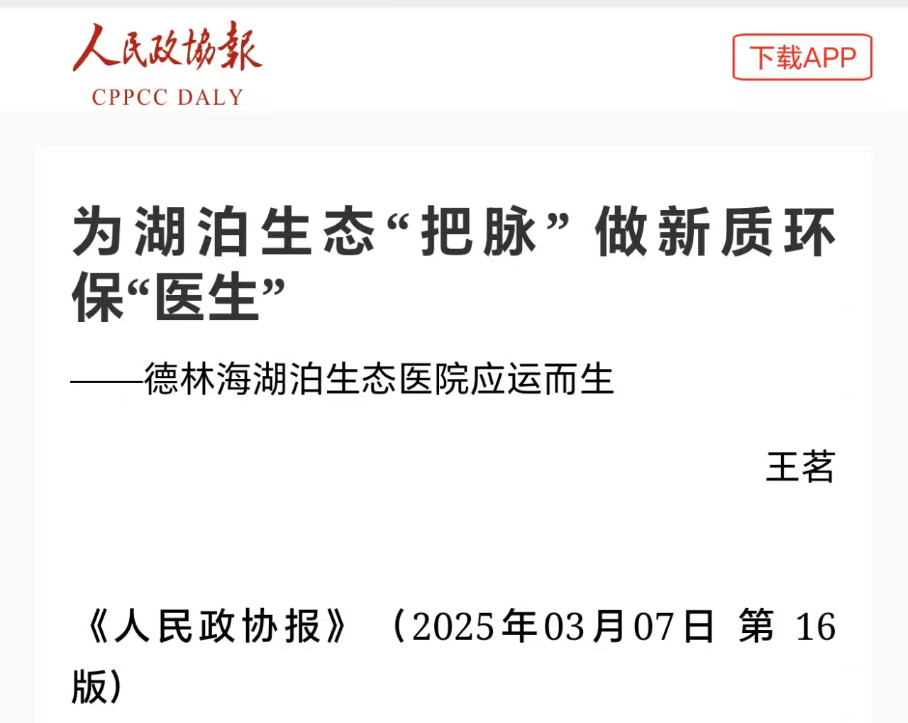 2025年3月7日,人民政協報發表文章《為湖泊生態“把脈” 做新質環?!搬t生”——德林海湖泊生態醫院應運而生》,文中對德林海湖泊生態醫院自主研發的加壓控藻技術、中宇宙數字孿生診驗系統和精準清淤技術等主流藍藻治理和湖庫富營養化內源治理技術以及湖庫保護治理創新模式——績效付費模式進行了詳細報道,并盛贊以“善水者 善于水”為發展理念的德林海湖泊生態醫院是新質環保企業代表。