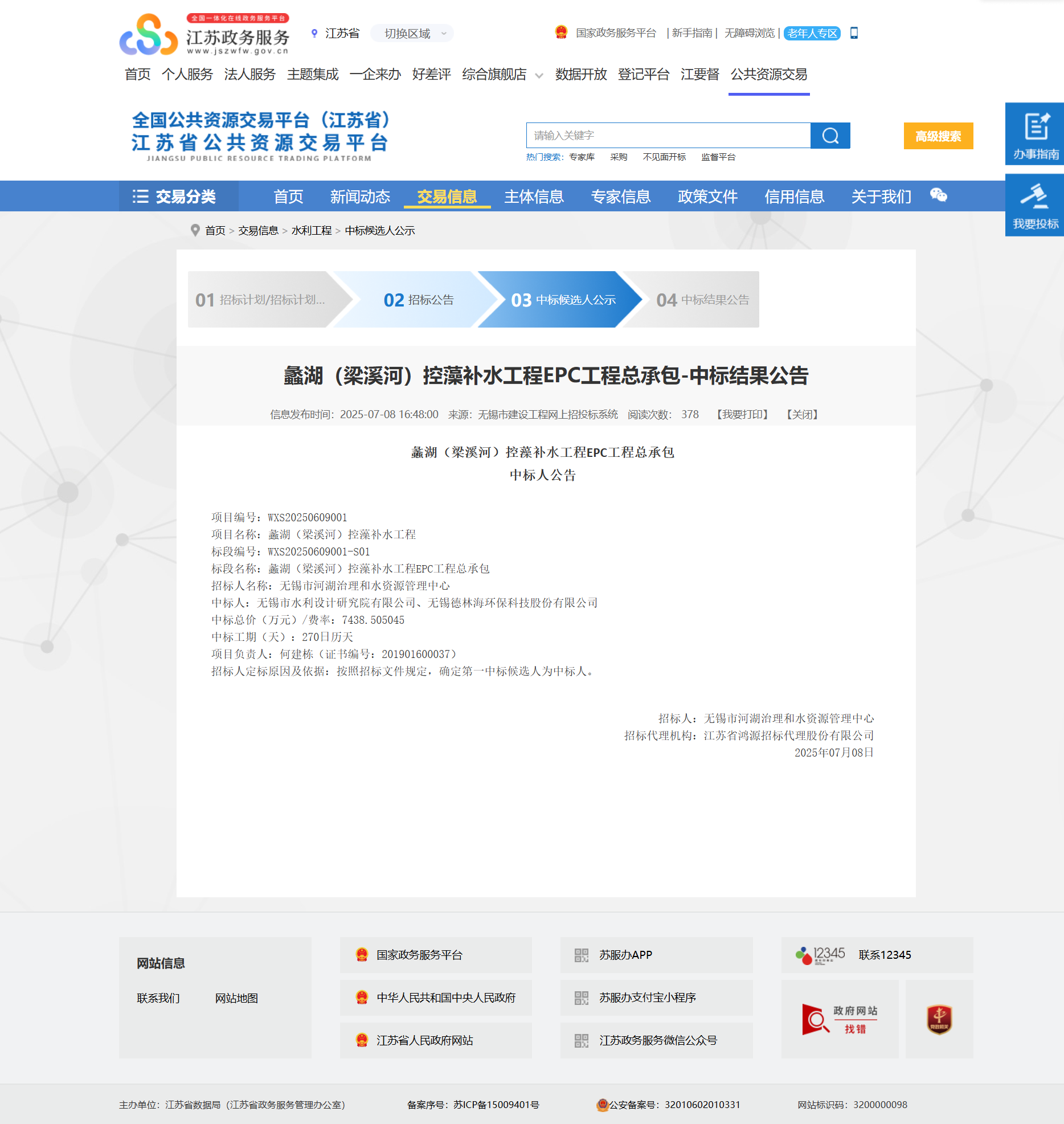 《蠡湖(梁溪河)控藻補(bǔ)水工程EPC工程總承包》項(xiàng)目中標(biāo)結(jié)果公告