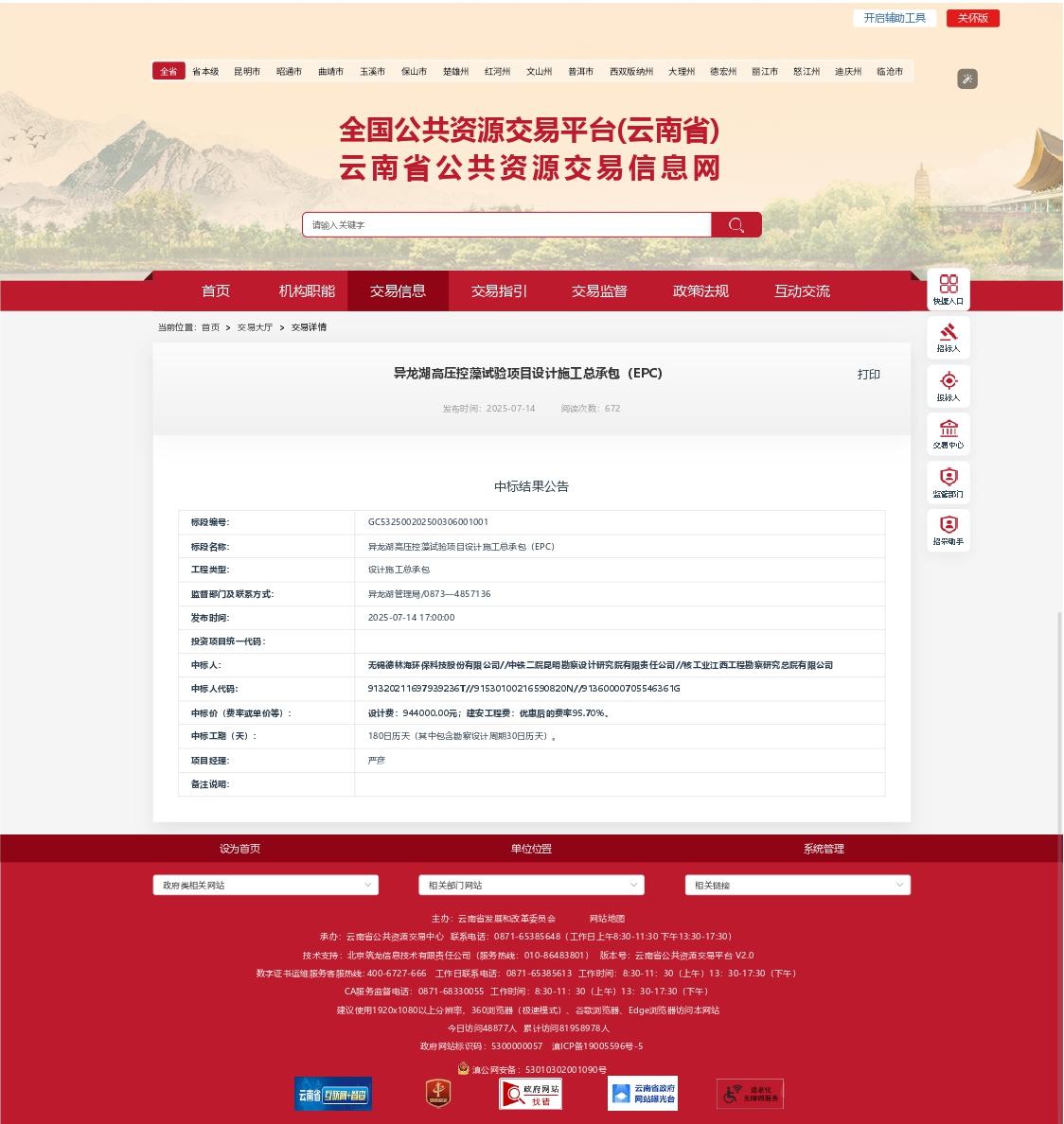 《異龍湖高壓控藻試驗(yàn)項(xiàng)目設(shè)計(jì)施工總承包(EPC)》項(xiàng)目中標(biāo)結(jié)果公告
